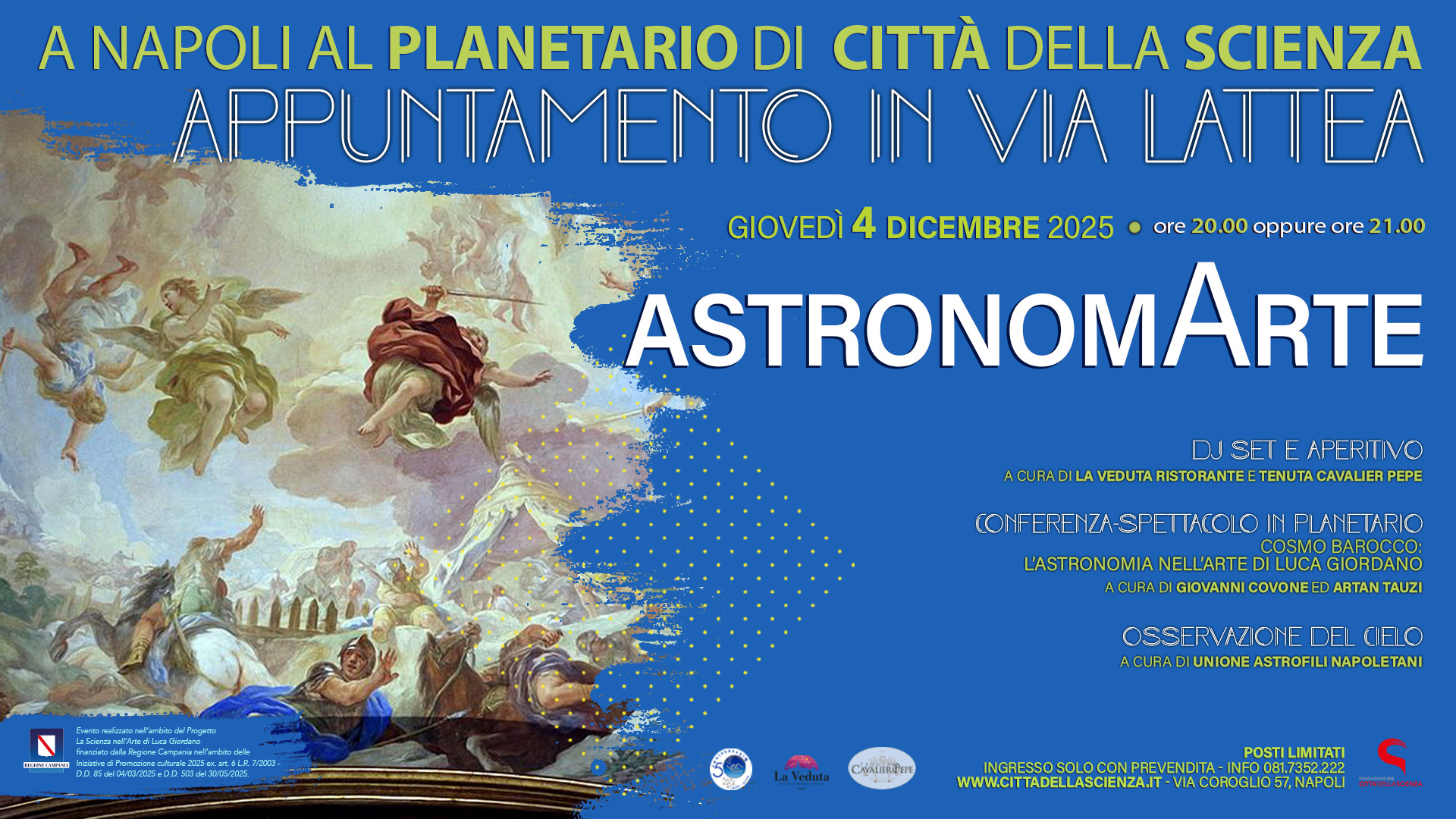 Preparatevi a vivere una serata fuori dal tempo e dallo spazio: un viaggio immersivo tra l’arte barocca e il cielo stellato. Sotto la cupola del Planetario, i capolavori di Luca Giordano prendono vita accanto a costellazioni, comete e nebulose. Dalla Galleria degli Specchi di Palazzo Medici Riccardi al “Ritratto d’astronomo”, il racconto di Giovanni Covone intreccia scienza e meraviglia, accompagnato dalle musiche dell’epoca eseguite dal vivo al violoncello dal maestro Artan Tauzi.